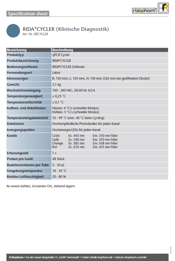 | Testformat | Proben pro Gerät: 48 Reaktionsröhrchen, Streifen mit 4 Röhrchen (RIDA®CYCLER-MIC-TUBES, Art. Nr. ZRC-MIC-TUBES) |