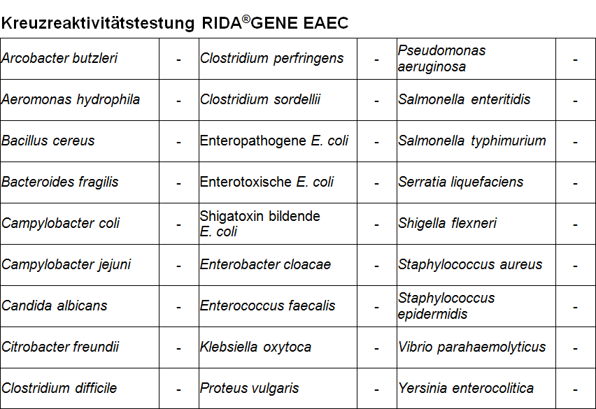 Für die in-vitro Diagnostik. RIDA®GENE EAEC ist eine multiplex real-time PCR zum direkten qualitativen Nachweis von enteroaggregativen E. coli (EAEC) in humanen Stuhlproben. Die RIDA®GENE EAEC multiplex real-time PCR soll die Diagnose einer durch enteroaggregative E. coli verursachten Gastroenteritis unterstützen.