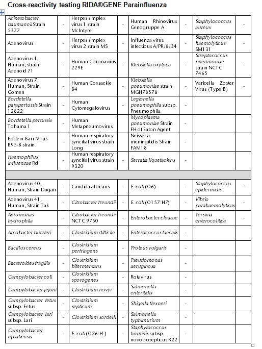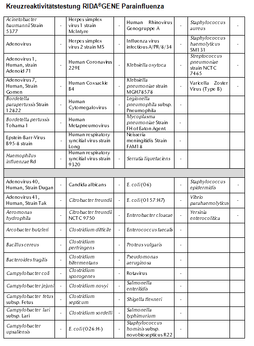 Der RIDA®GENE Parainfluenza Test ist zur Unterstützung der Diagnose von Parainfluenza-Infektionen (Parainfluenza 1, Parainfluenza 3 und Parainfluenza 2/4) bei Patienten mit Symptomen einer respiratorischen Infektion in Verbindung mit anderen klinischen Befunden und Laborbefunden vorgesehen.