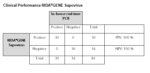 Für die in-vitro Diagnostik. RIDA®GENE Sapovirus ist eine multiplex real-time RT-PCR zum direkten qualitativen Nachweis von Sapovirus aus humanen Stuhlproben. Die RIDA®GENE Sapovirus real-time RT-PCR soll die Diagnose einer durch Sapovirus verursachten Gastroenteritis unterstützen.