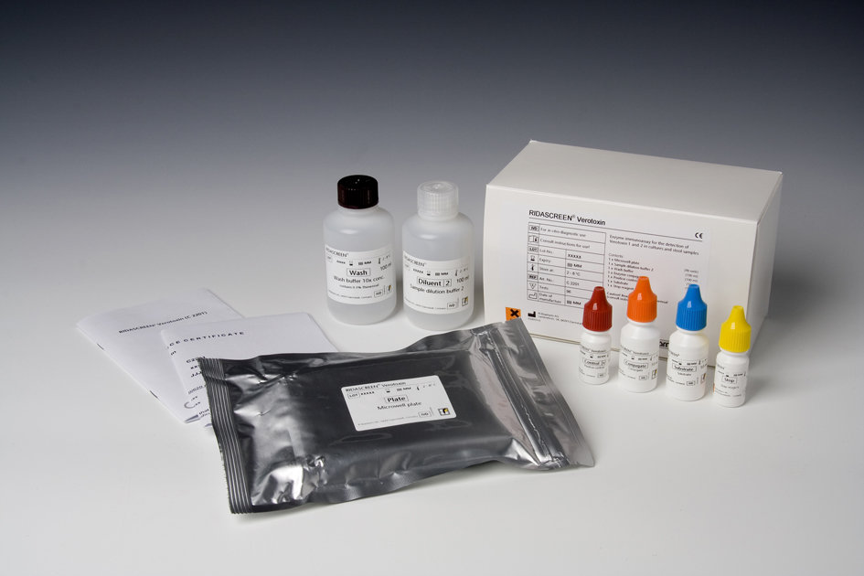 Für die in vitro Diagnostik. Der RIDASCREEN® Verotoxin ist ein Enzymimmunoassay zum qualitativen Nachweis der Verotoxine (Shiga-like Toxine I und II) aus einer Stuhlanreicherung in mTSB-Bouillon.