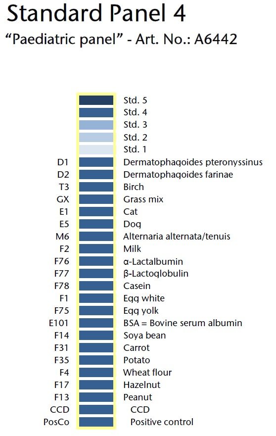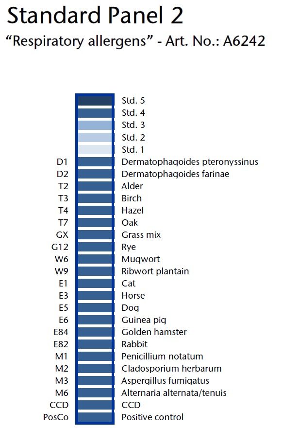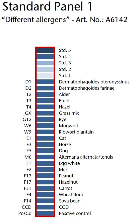This test is based on the principles of the immunoblot method. Various allergens are attached to the surface of nitrocellulose membranes in separate lines depending on the configuration of the panel. Allergen-specific IgE antibodies react with the appropriate allergens, if they are present in the patients’ samples. In a second step biotin-conjugated anti-human IgE antibodies bind to the attached antibodies. During a third incubation step the biotin binds to a streptavidin peroxidase conjugate. In a final incubation step the peroxidase turns the colorless substrate tetramethylbenzidine (TMB) into a bluish purple final product. After each individual incubation a washing step follows to remove unbound material. The intensity of the blue color is proportional to the amount of allergen-specific antibodies in the patient’s serum.