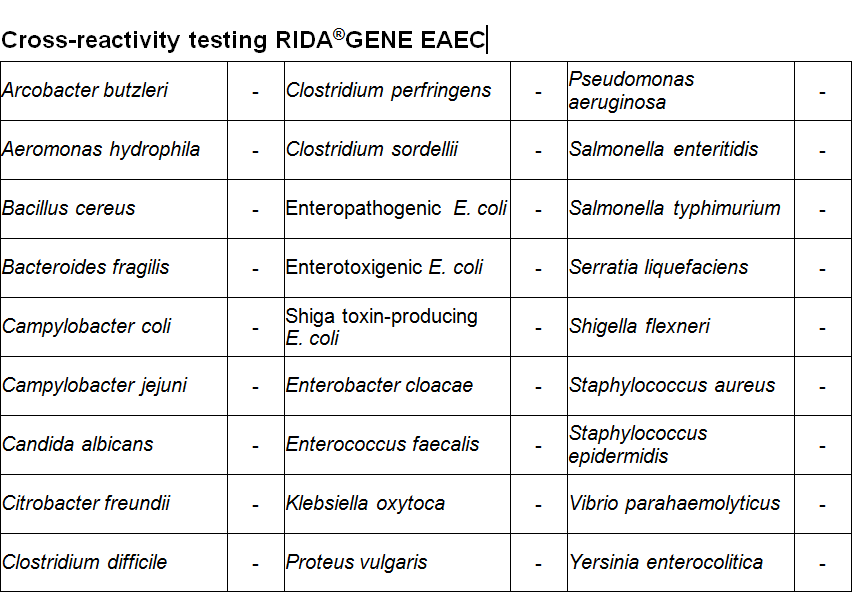 For in vitro diagnostic use. RIDA®GENE EAEC is a multiplex real-time PCR for the direct, qualitative detection of enteroaggregative E. coli (EAEC) in human stool samples. RIDA®GENE EAEC multiplex real-time PCR is intended for use as an aid in diagnosis of gastroenteritis caused by enteroaggregative E. coli.