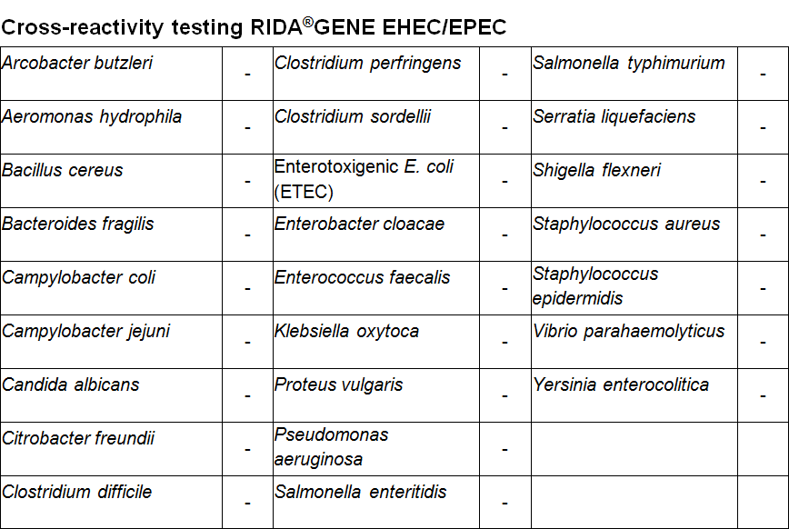 RIDA®GENE EHEC/EPEC real-time PCR is intended for use as an aid in diagnosis of gastroenteritis caused by pathogenic Escherichia coli and Shigella spp., respectively.