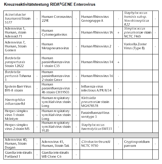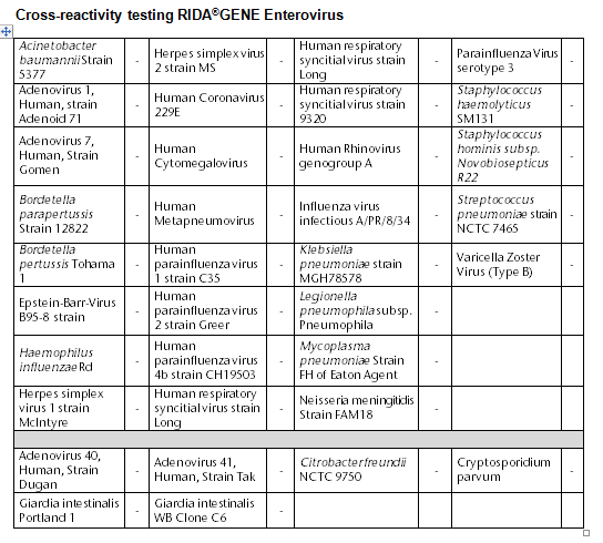 RIDA®GENE Enterovirus real-time RT-PCR is intended for use as an aid in diagnosis of infections caused by enteroviruses (poliovirus, echovirus, coxsackievirus, human enterovirus 70/71).