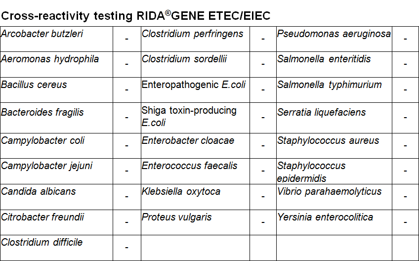 For in vitro diagnostic use. RIDA®GENE ETEC/EIEC is a multiplex real-time PCR for the direct, qualitative detection and differentiation of the virulence-factor genes of ETEC and EIEC/Shigella spp. in human stool samples and cultures. RIDA®GENE ETEC/EIEC multiplex real-time PCR is intended for use as an aid in diagnosis of gastroenteritis caused by pathogenic Escherichia coli and Shigella spp., respectively.