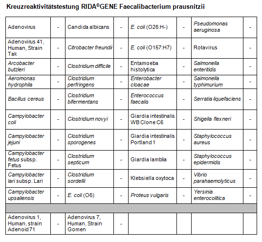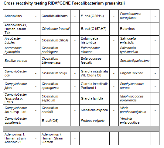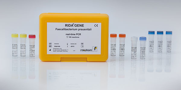 For in vitro diagnostic use. RIDA®GENE Faecalibacterium prausnitzii is a multiplex real-time PCR for the direct qualitative and quantitative detection of Faecalibacterium prausnitzii DNA in human stool samples.
