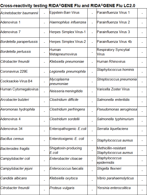 The RIDA®GENE Flu test is intended to support the differential diagnosis of influenza virus infections in patients with symptoms of respiratory infection in connection with other clinical and laboratory findings.