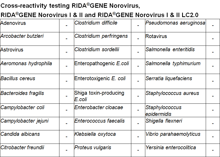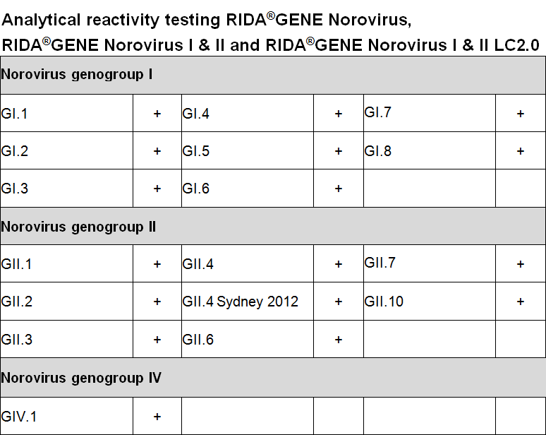 For in vitro diagnostic use. RIDA®GENE Norovirus I & II is a real-time multiplex RT-PCR for the direct, qualitative detection and differentiation of norovirus (genogroup I and II) in human stool samples. RIDA®GENE Norovirus I & II real-time multiplex RT-PCR is intended for use as an aid in diagnosis of gastroenteritis caused by noroviruses.
